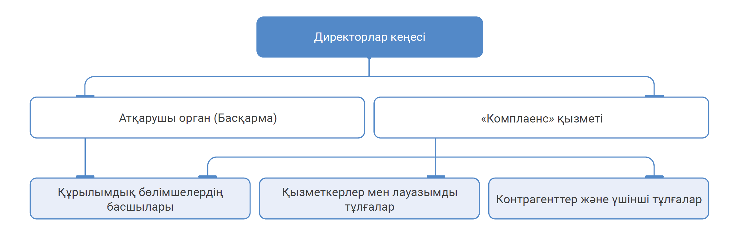 «Самұрық-Энерго» АҚ-да Директорлар кеңесіне ұйымдық және функционалдық жағынан бағынатын тәуелсіз бөлімше – «Комплаенс» қызметі жұмыс істейді. «Комплаенс» қызметінің жұмысын бағалауды Директорлар кеңесі тоқсан сайынғы есептілік негізінде жүргізеді. Сыбайлас жемқорлыққа қарсы заңнаманы сақтау мақсатында Компаниялар тобының ЕТҰ ұйымдық құрылымдарына Директорлар кеңесіне немесе ЕТҰ Бақылау кеңесіне есеп беретін комплаенс-офицерлер лауазымдары енгізілді.
