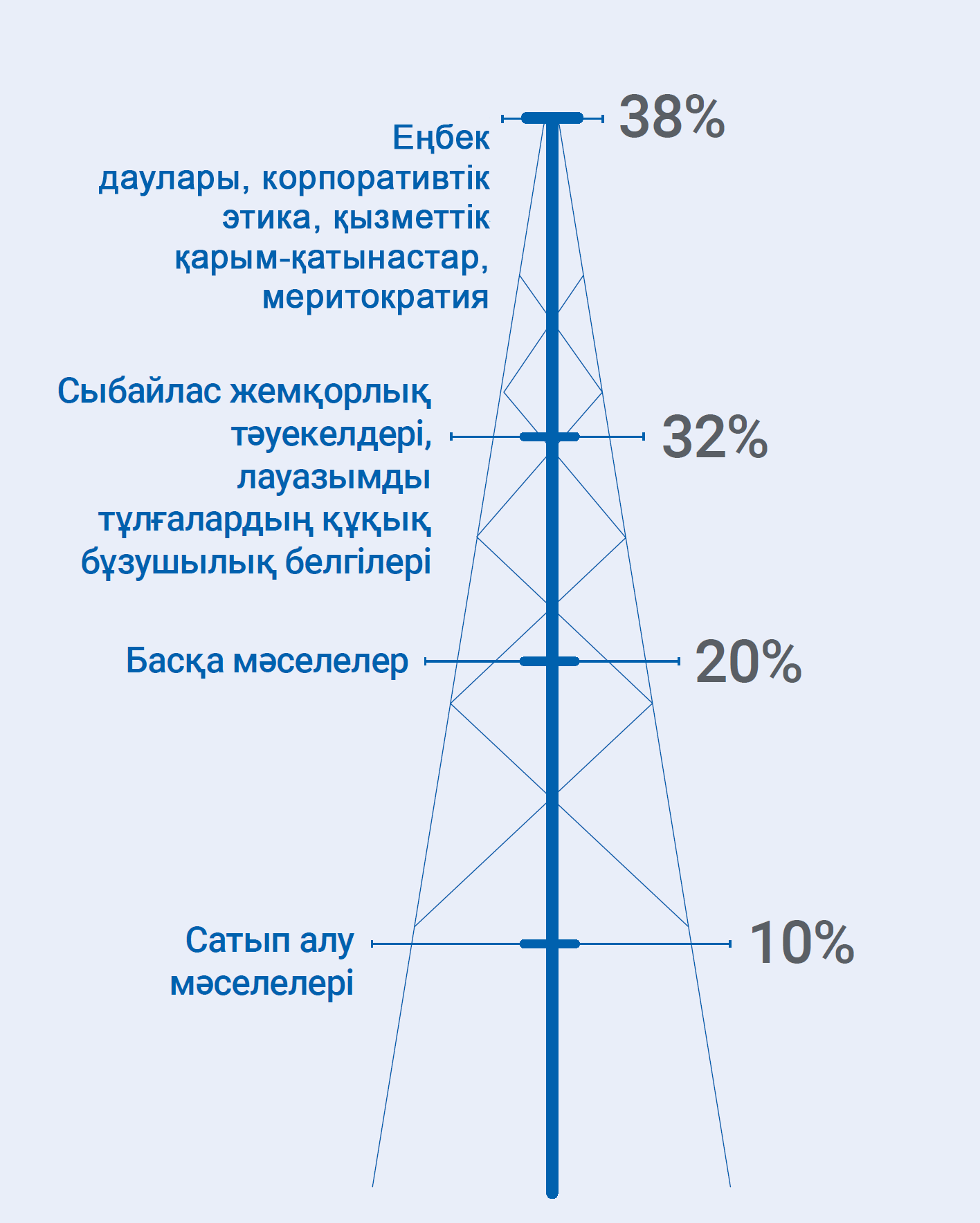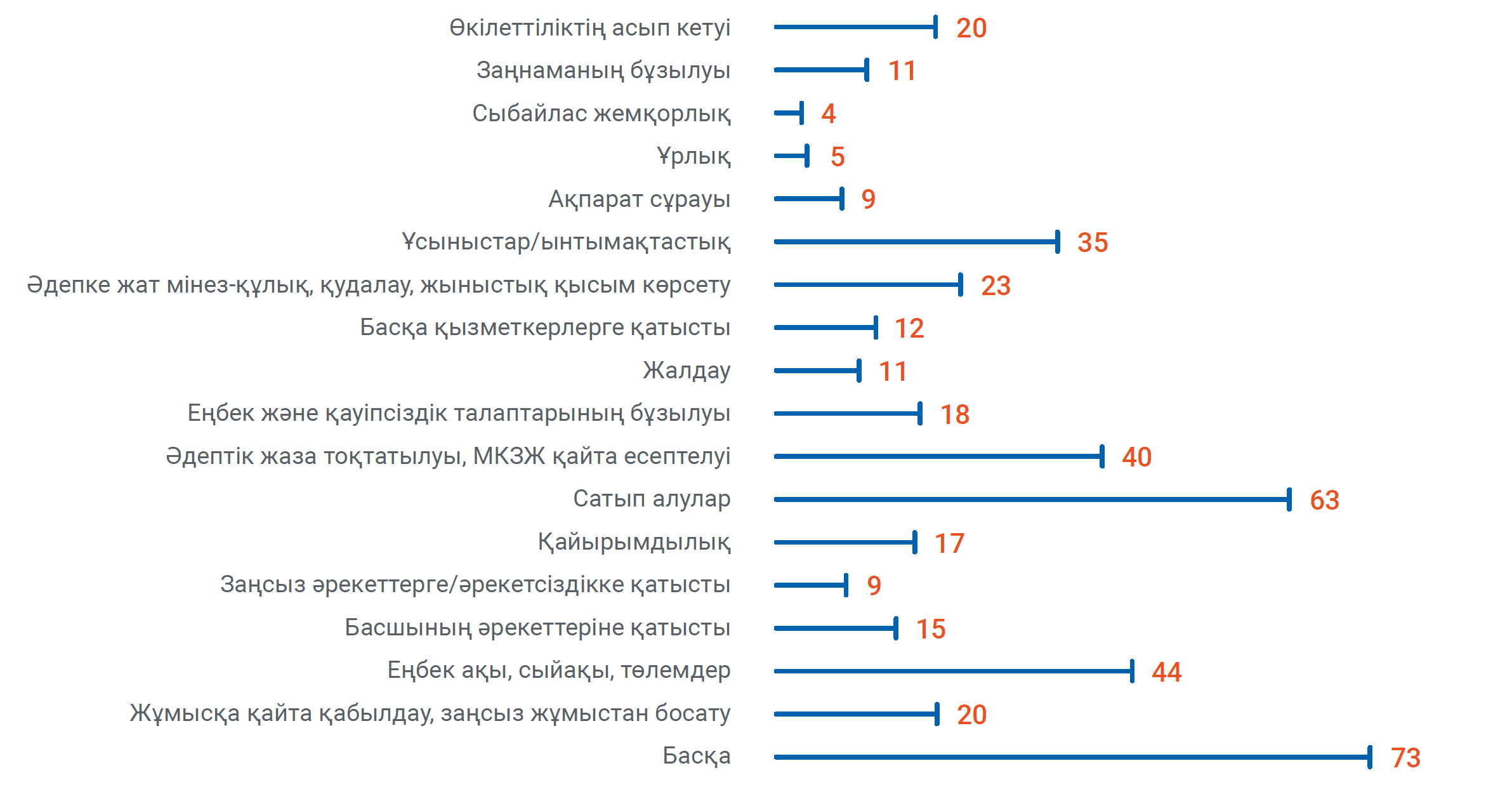 Сонымен қатар, басшылықпен даулар, тәртіптік шараларға келіспеу және бос лауазымдарға тағайындаудағы ашықтықтың жоқтығы туралы жүгінулер де байқалды