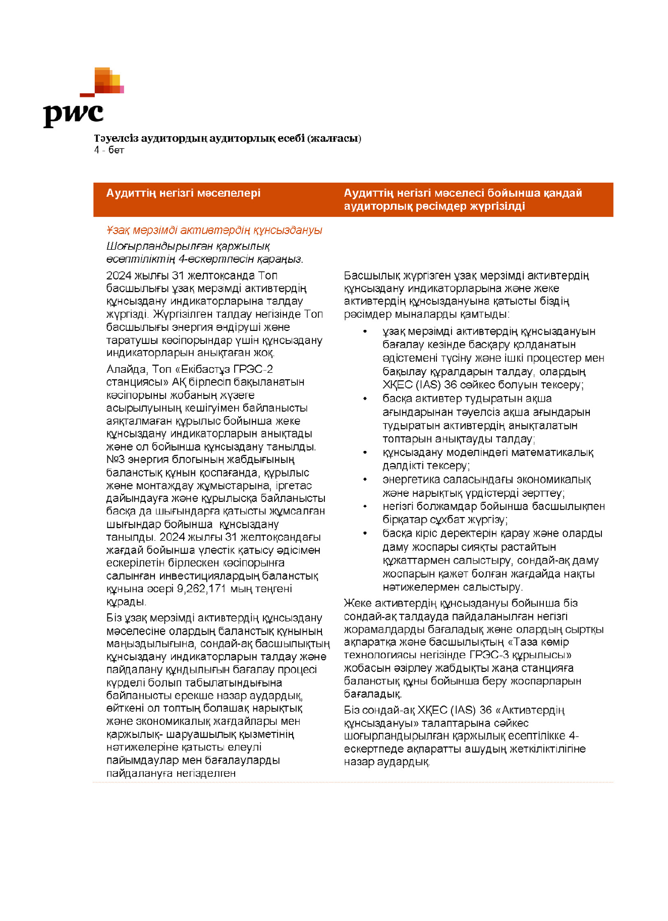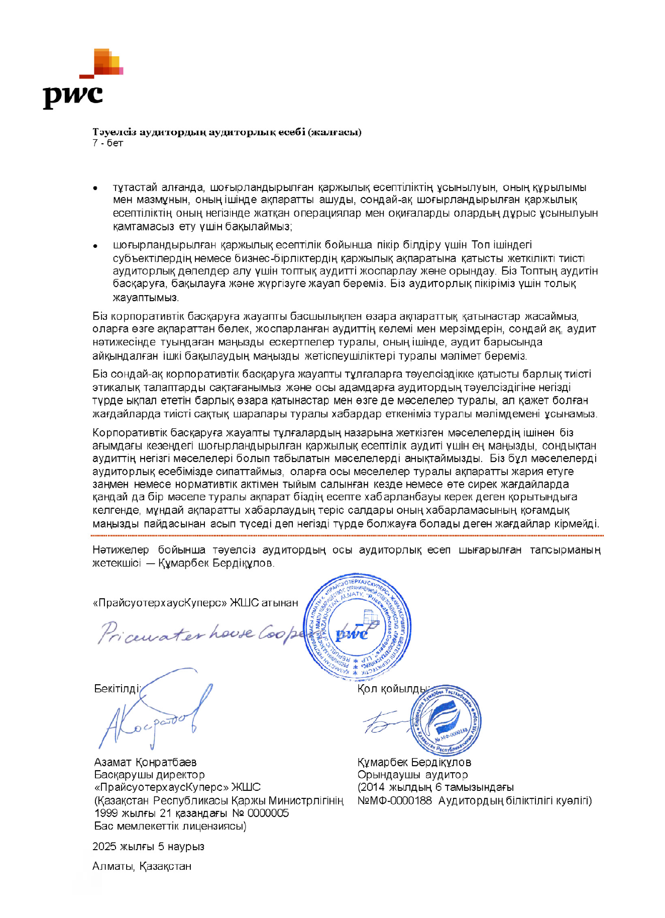 2025 жылғы 6 қаңтарда Топ Самұрық-Қазынаға борыштың негізгі сомасы есебіне 1,736,828 мың теңге және облигациялар бойынша 1,324,331 мың теңге сыйақы төледі.