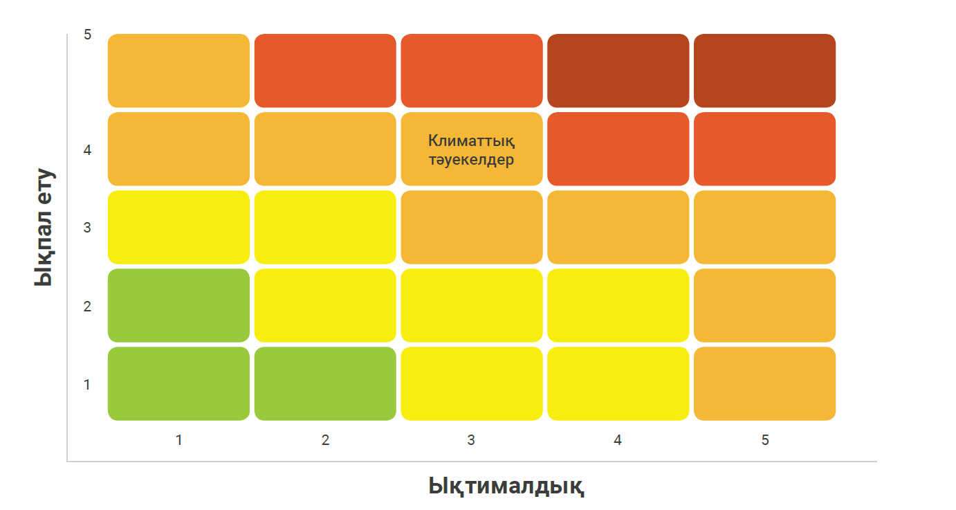 Беделді тәуекелдер | Мүдделі тараптардың компанияның төмен көміртекті экономикаға көшуге қатысуы туралы түсінігі | Тұтынушылардың, инвесторлардың және басқа да мүдделі тараптардың сенімін жоғалту, бәсекеге қабілеттіліктің төмендеуі | Қызметтің ашықтығы, климаттық стратегия туралы жария түрде есеп беру, экологиялық тұрақты бастамаларға қатысу |