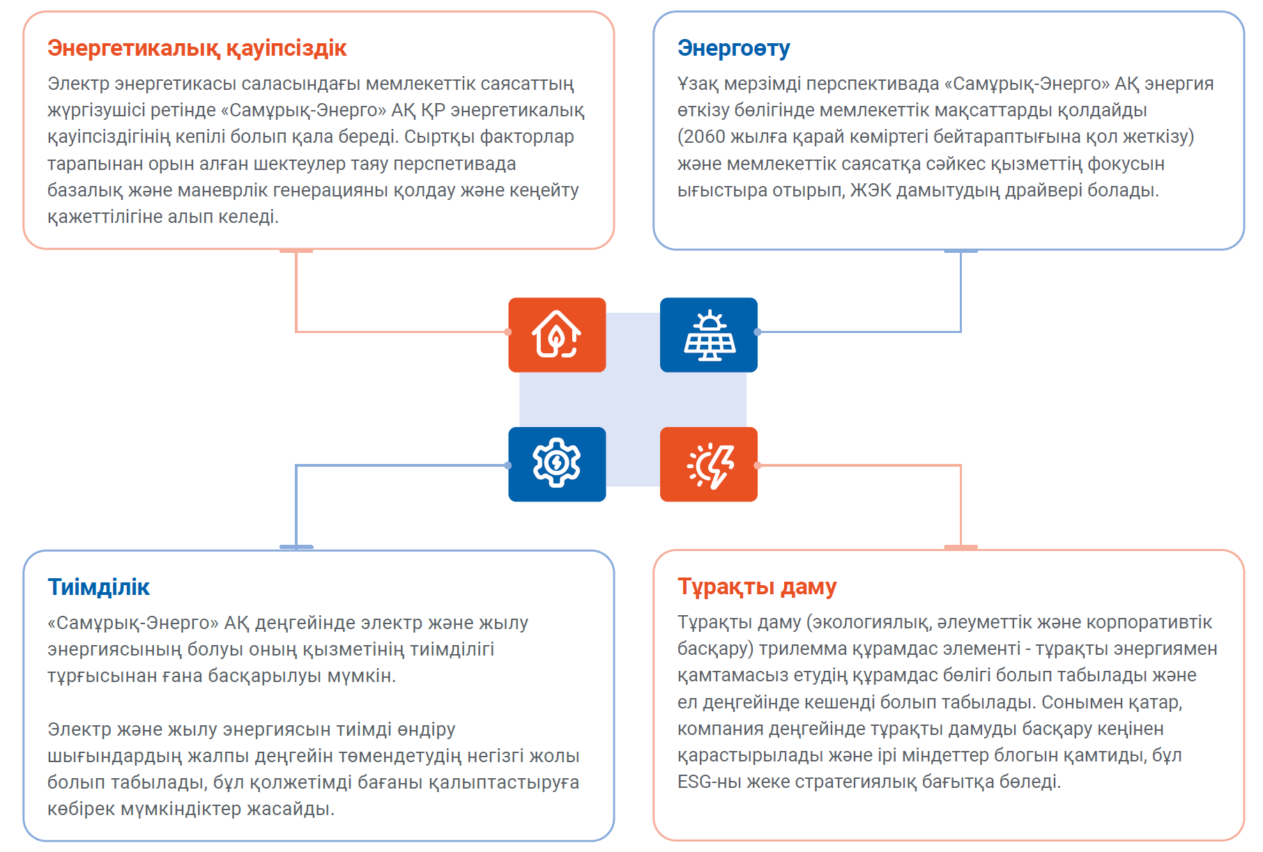 «Самұрық-Энерго» АҚ-ның басымдықтары энергетикалық қауіпсіздік, энергияның ауысуы, тұрақты даму және тиімділік болып табылады