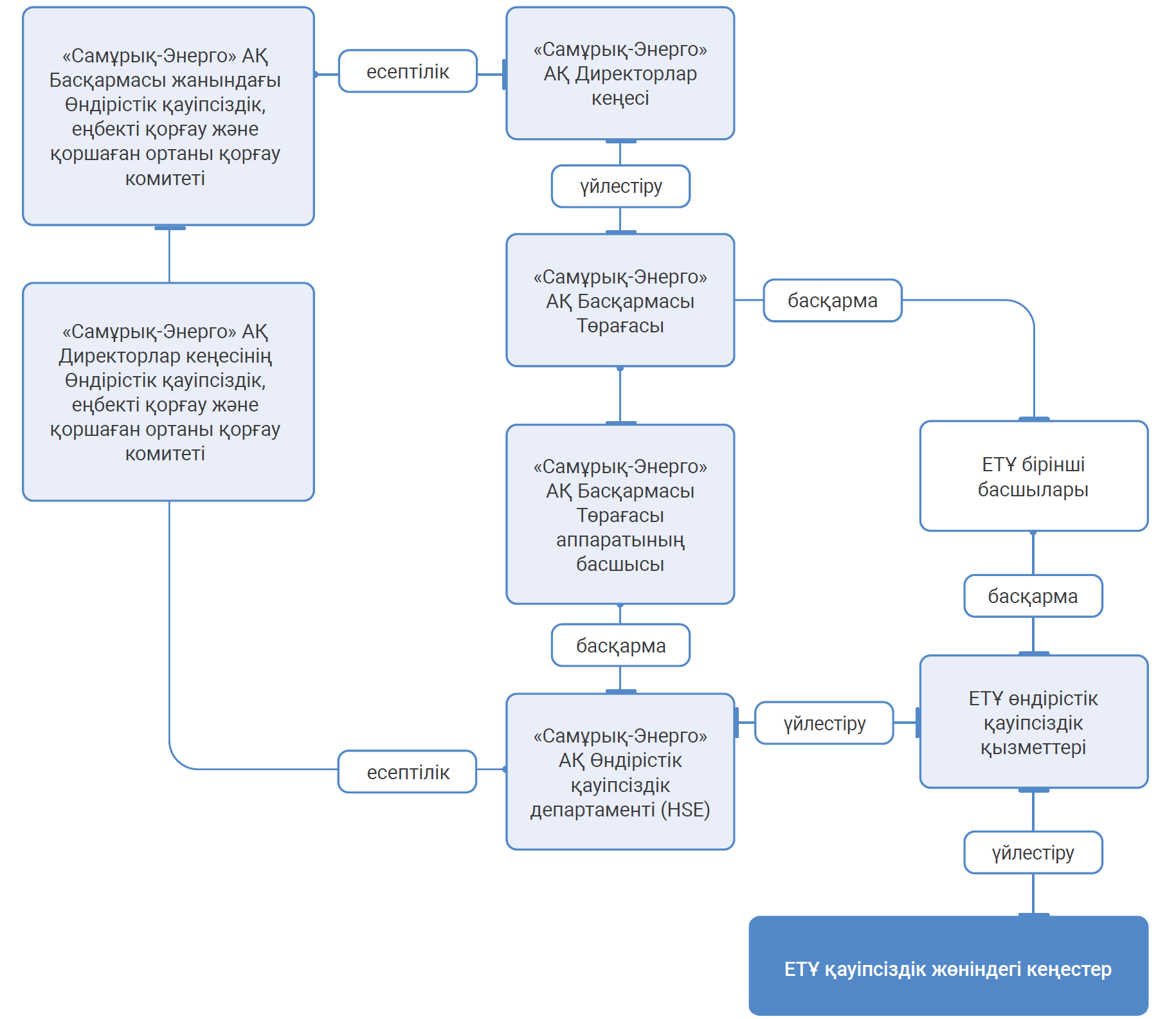 Қауіпсіздік мәселелерін үйлестіруді Басқарма Төрағасы алдында есеп беретін және компанияда және ЕТҰ-да еңбекті қорғау жүйесін жақсарту жөніндегі шаралардың іске асырылуын бақылайтын HSE жөніндегі директор жүзеге асырады. Бөлімше басшысы бұзушылықтардың алдын алуға, инциденттерге ден қоюға, тәуекелдерді мониторингілеуге және талдауға жауап береді. Еншілес ұйымдарда өндірістік қауіпсіздік қызметтері бірінші басшыларға бағынады, ал олардың біліктілік құрамы тиімділікті арттыру үшін үнемі қайта қаралып отырады.