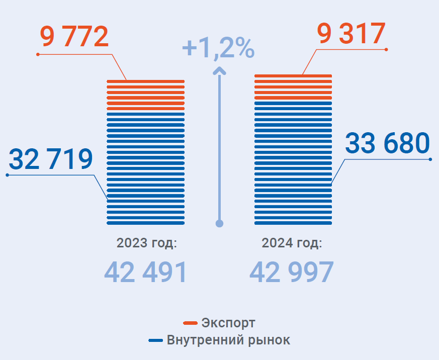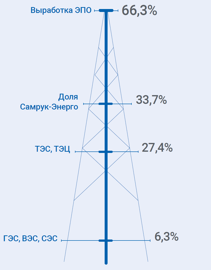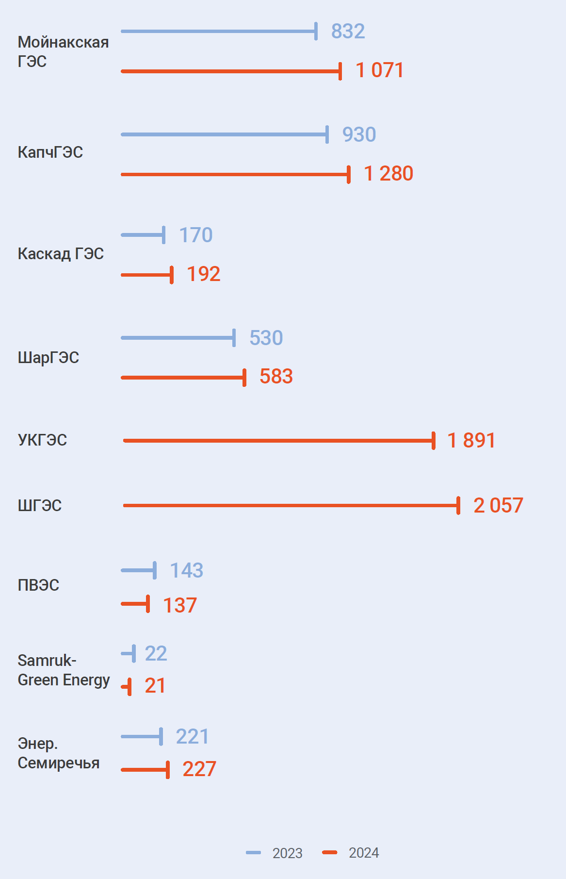 Объем производства электроэнергии за 2024 год составил 39 772 млн кВтч, что выше на 12,6% или 4 442 млн кВтч в сравнении с прошлым годом. Основное увеличение произошло по АО «Мойнакская ГЭС» на 238 млн кВтч (на 28,6%), АО «Шардаринская ГЭС» на 54 млн кВтч (на 10%) по причине увеличения водности бассейнов, АО «Станция Экибастузская ГРЭС-2» на 386 млн кВтч (на 7%) в связи с увеличением продажи электроэнергии Единому закупщику из-за выхода из строя оборудования ТОО «Экибастузская ГРЭС-1». В объем производства электроэнергии за 2024 г. также вошла выработка УКГЭС и ШГЭС, включенных в периметр АО «Самрук-Энерго» с 2024 г.