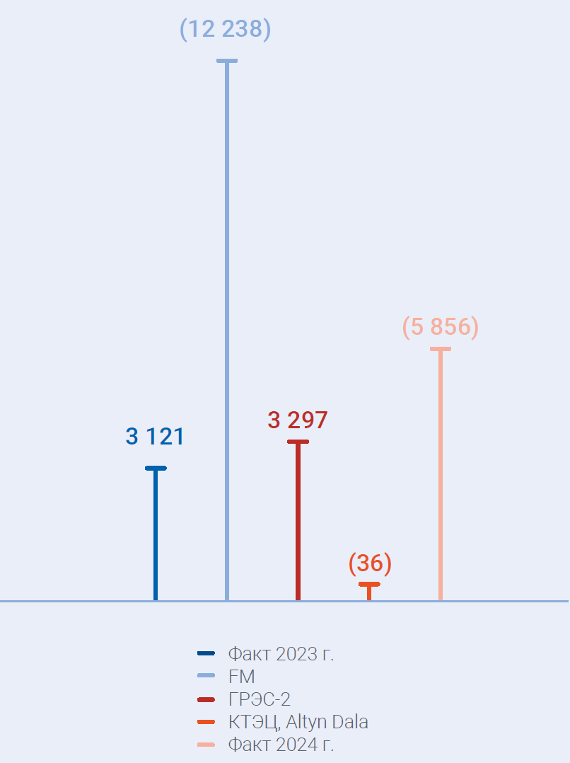 Финансовые расходы по итогам 2024 г. составили 31 322 млн тенге, что выше фактического значения за 2023 г. на 6 078 млн тенге. Увеличение за счет отражения расходов по займам ТОО «Экибастузская ГРЭС-1» (Блок №1) в текущих расходах.