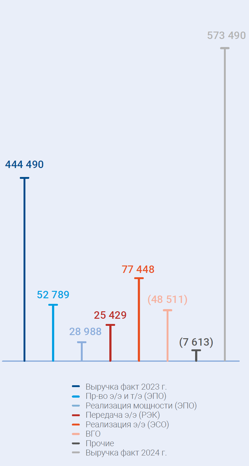 По сегменту производство электроэнергии рост выручки имел место за счет включения в периметр консолидации ТОО «АЭС Усть-Каменогорская ГЭС» и ТОО «АЭС Шульбинская ГЭС», роста объема реализации гидроэлектростанций в связи с большей приточностью, увеличения предельных тарифов ЭПО с 1 января 2024 г., а также за счет увеличения объёмов реализации мощности по итогам проведенных торгов на 2024 г. и включения в периметр консолидации объемов мощностей ТОО «АЭС Усть-Каменогорская ГЭС» и ТОО «АЭС Шульбинская ГЭС».