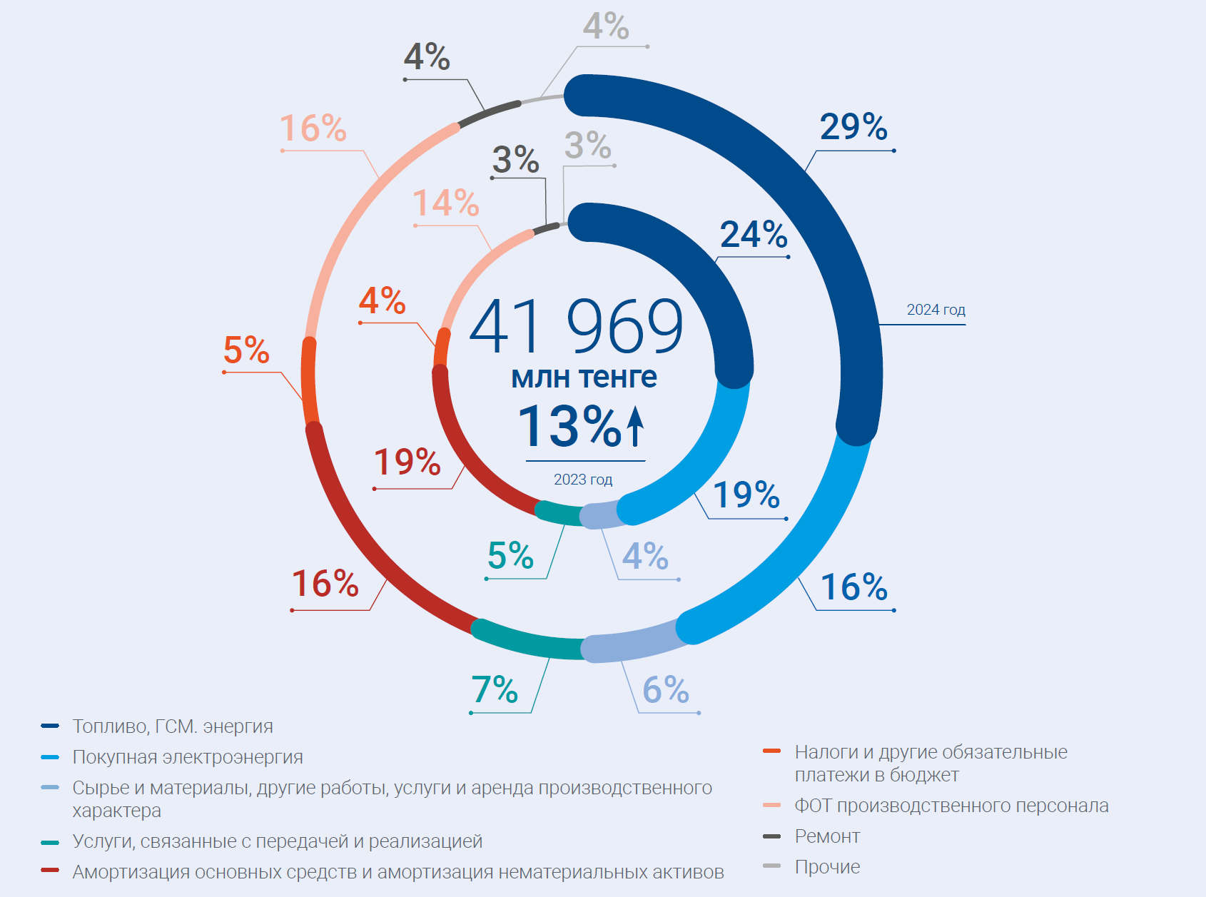 Себестоимость по итогам 2024 г. составила 371 645 млн тенге, что на 13% выше факта 2023 г. Увеличение расходов за счет увеличения переменных производственных расходов (уголь, газ, услуги АО «KEGOC» и др) в связи с ростом цены на товары и услуги, расходов на балансирующем рынке электроэнергии (далее – БРЭ), расходов на оплату труда производственного персонала в рамках оказания социальной поддержки работникам ДЗО, по налогам и другим обязательным платежам в бюджет, индексации цен на сырье и производственные материалы.