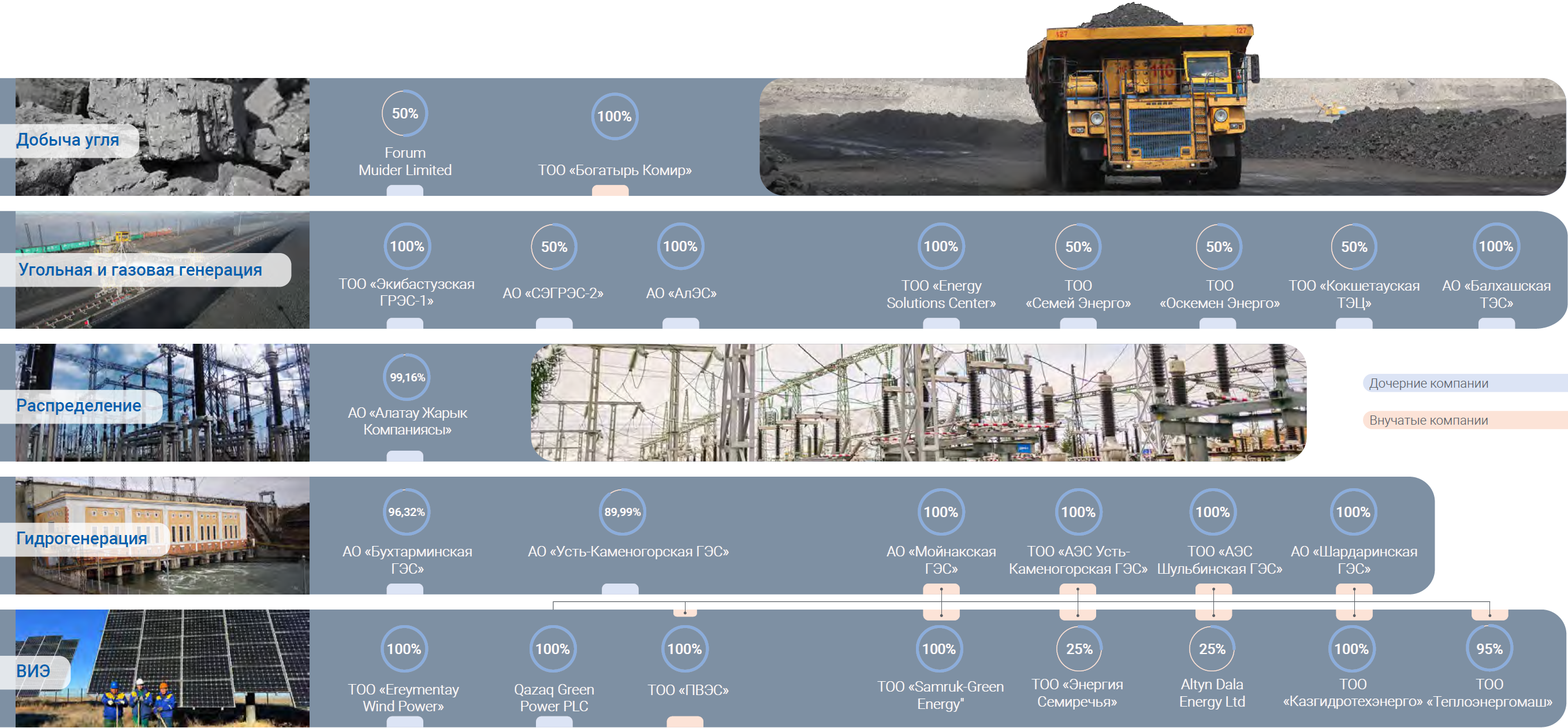 В 2024 году АО «Самрук-Энерго» осуществило ряд стратегических изменений, направленных на оптимизацию управления активами и развитие энергетического сектора. 14 мая в периметр активов компании были включены 100% доли участия в ТОО «АЭС Усть-Каменогорская ГЭС» и ТОО «АЭС Шульбинская ГЭС». 17 июня Группа АО «Самрук-Энерго» приняла в доверительное управление имущественный комплекс Экибастузской ТЭЦ, находящийся в собственности акимата г. Экибастуз. 24 июня совместно с АО «Самрук-Қазына» были учреждены три совместных предприятия с равным распределением долей (по 50%): ТОО «Кокшетауская ТЭЦ», ТОО «Семей Энерго» и ТОО «Оскемен Энерго».